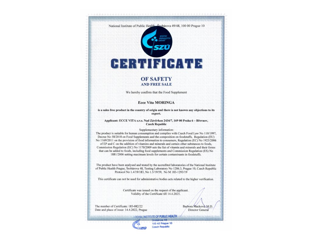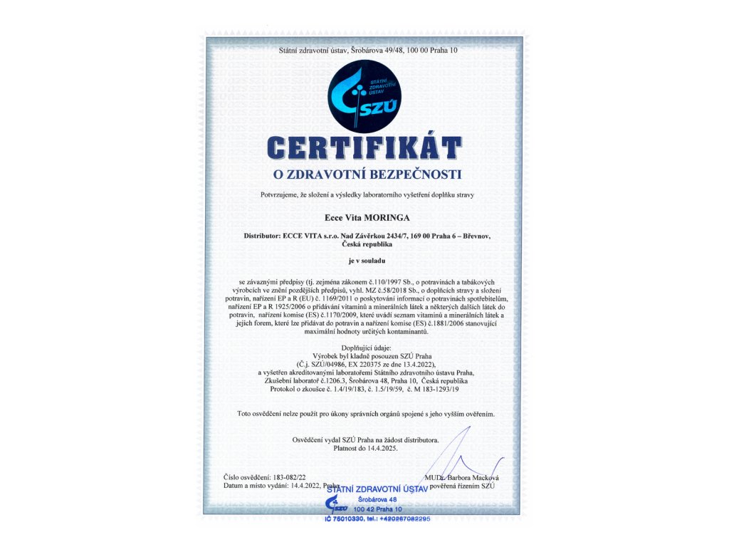 Ecce Vita® Moringa obsahuje extrakt z listů Moringa oleifera. Listy této rostliny jsou ceněné pro vysoké nutriční hodnoty. Říká se ji přírodní multivitamin. Obsahuje jak minerály, stopové prvky i vitaminy, antioxidanty, proteiny a další aktivní látky v přirozených a vstřebatelných formách. Například v jedné dávce tří kapsli máme 0,33 mg riboflavinu (vitamin B2), což odpovídá cca 23,5% denní doporučené dávky.