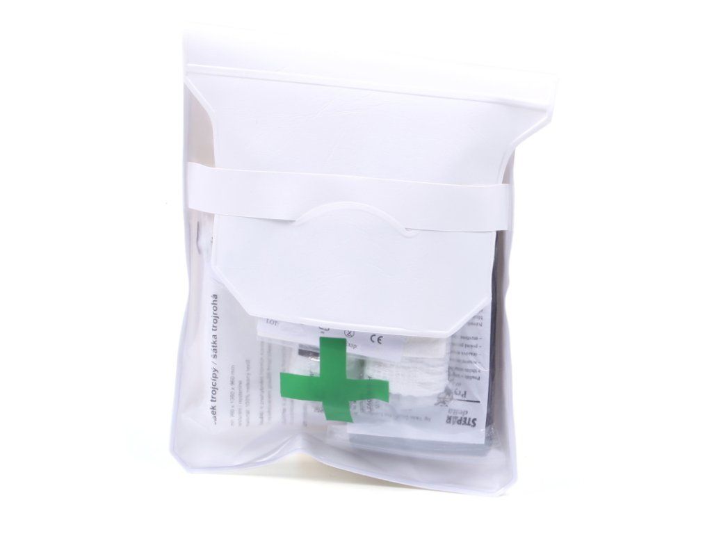Motolékárnička v bílém plastovém pouzdru označena zeleným křížem. Odpovídá současné vyhlášce č. 206/2018 Sb.  Vejde se do úložného prostoru na motocyklu.