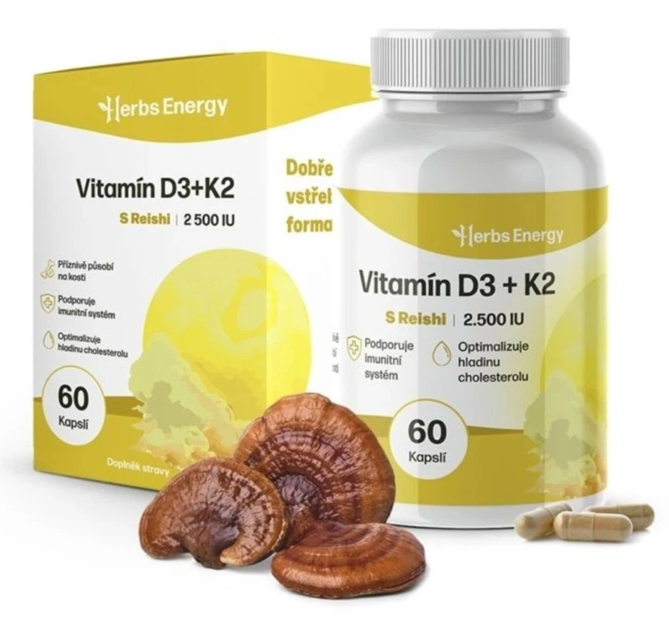 - Vitamin D – důležitý zejména v období s nedostatkem slunečního záření. Vitamín D od Herbs Energy navíc obsahuje i vitamín K a houby reishi pro maximální podporu imunitního systému,