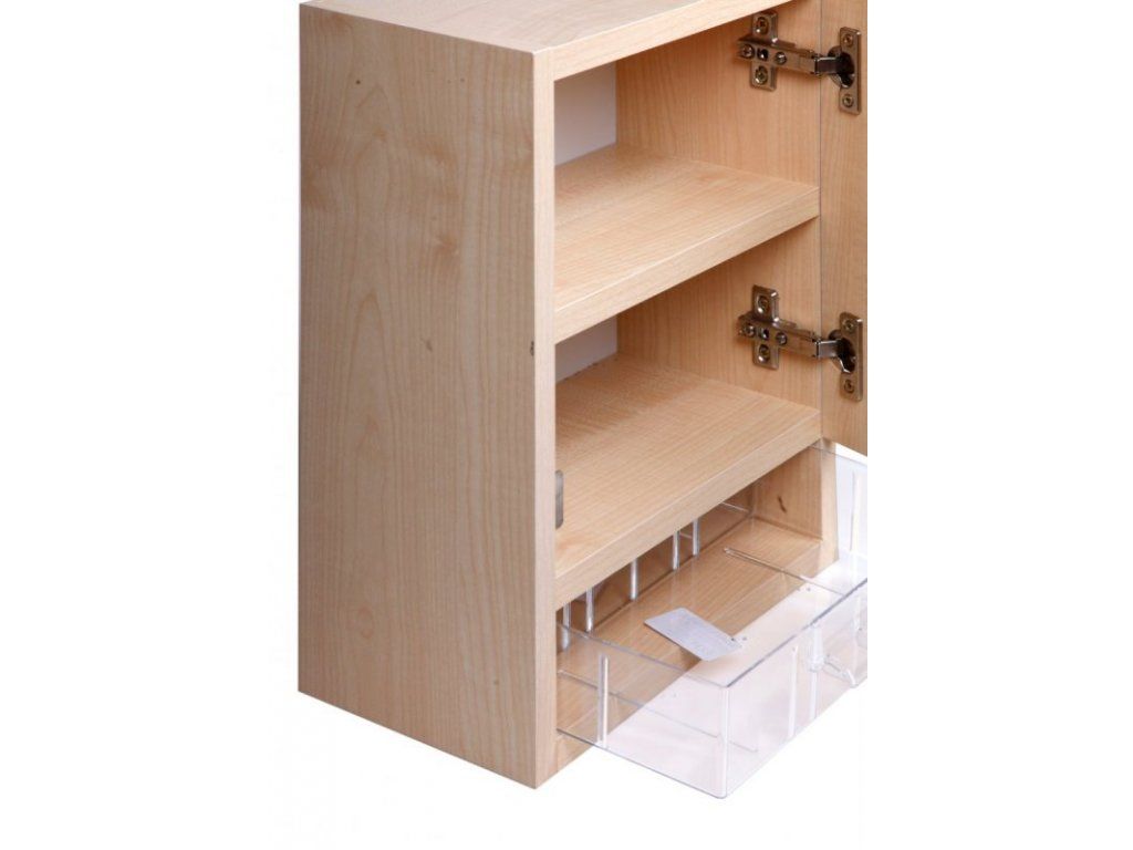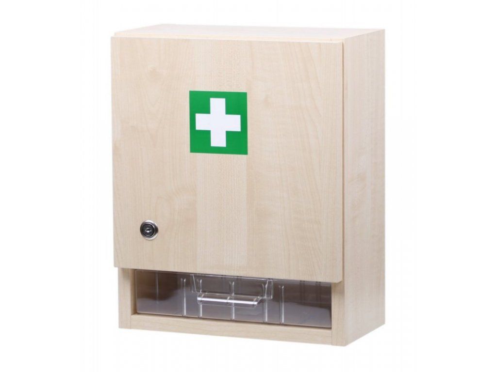 Lékárnička obsahuje zdravotnický materiál dostačující k ošetření až 30 osob. Uzamykatelná skříňka lékárničky o rozměru 40 cm x 31 cm x 17 cm je vyrobena z kvalitní dřevotřísky. Její vnitřek je pevnou přepážkou rozdělen na 2 stejné části, přičemž jedna z nich je zcela volná a lze do ní umístit další zdravotnický materiál dle uvážení. Úložný prostor rozšíří i plastová zásuvka ve spodní části skříňky. Součástí balení je i montážní materiál – hmoždinky a šrouby.