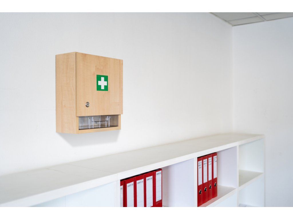 Lékárnička obsahuje zdravotnický materiál dostačující k ošetření až 30 osob. Uzamykatelná skříňka lékárničky o rozměru 40 cm x 31 cm x 17 cm je vyrobena z kvalitní dřevotřísky.