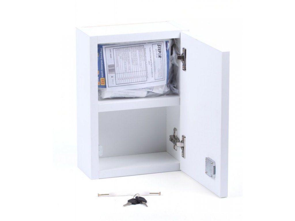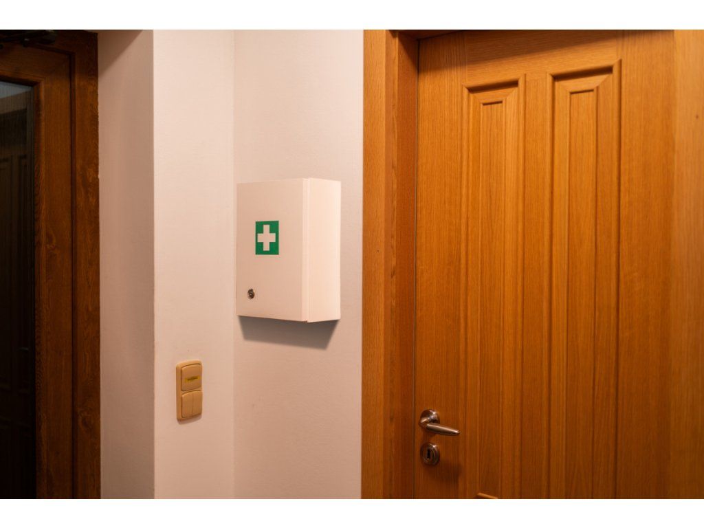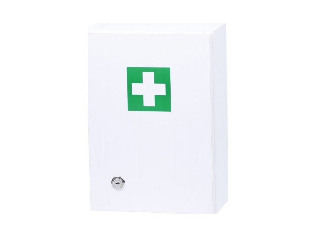 Praktická dřevěná lékárnička vybavená zdravotnickým materiálem pro 5 osob, uvnitř je rozdělena policí na dvě části, je v ní tedy dostatek prostoru pro jakoukoliv další výbavu. Rozměr lékárničky je 33 cm x 23 cm x 12 cm, skříňka je uzamykatelná, součástí balení je montážní materiál pro připevnění lékárničky na zeď.