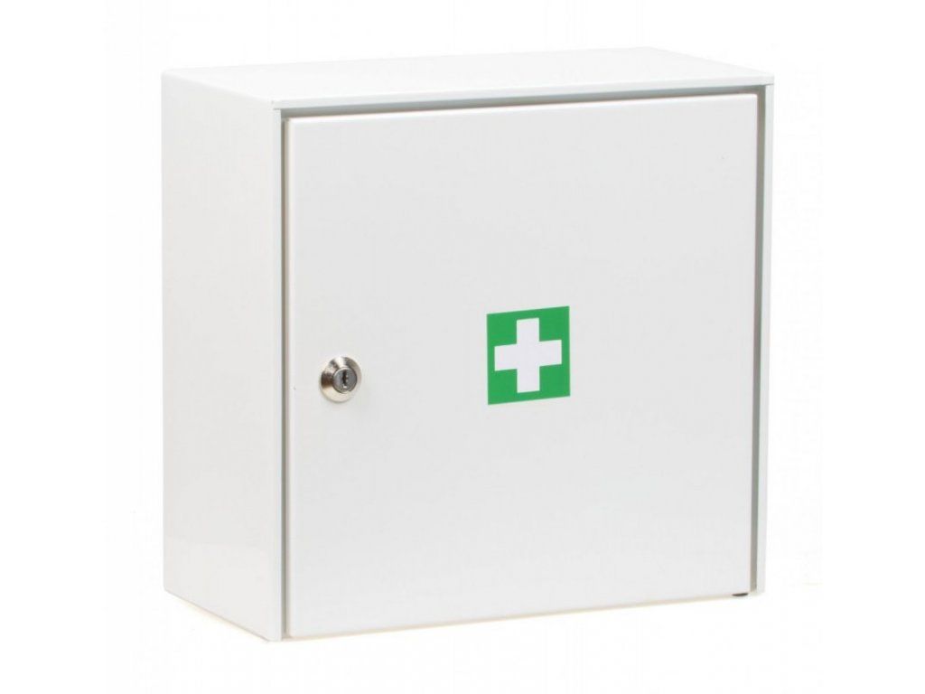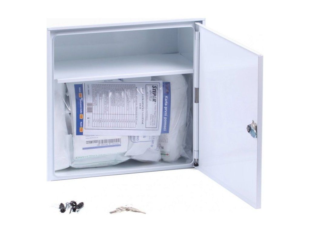 Nástěnná lékárnička pro 30 osob kovová je navržena tak, aby zajistila zdravotnický materiál až pro 30 osob, které potřebují ošetření. Lékárnička je vyrobena z kovu a rozměr skříňky je 30 cm x 30 cm x 15 cm. Skříňka je uvnitř poličkou rozdělena na dva stejné prostory. Kovové provedení je praktičtější na údržbu, skříňka se dá lehce umýt. Skříňka lékárničky je uzamykatelná, k dispozici jsou 2 klíčky. Součástí lékárničky je i montážní materiál – šrouby a hmoždinky.