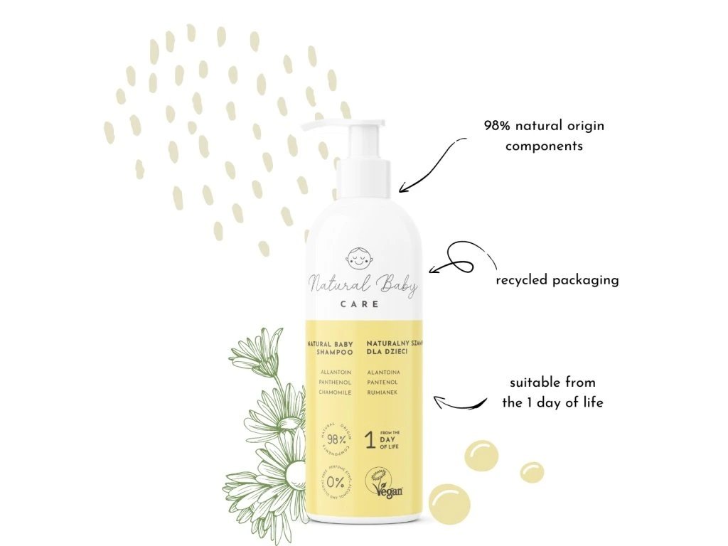 Natural Baby CARE dětský šampon na vlasy od 1. dne narození. Jemná pokožka novorozenců a dětí je velmi citlivá, jemná a potřebuje čistou a jemnou péči. Šampon na vlasy Natural Baby care splňuje všechny tyto požadavky a potřeby dětské pokožky.
