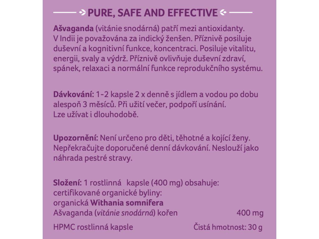 Jedna kapsle obsahuje 400 mg sušeného kořene v bio kvalitě. Kapsle je z přírodní celulózy.