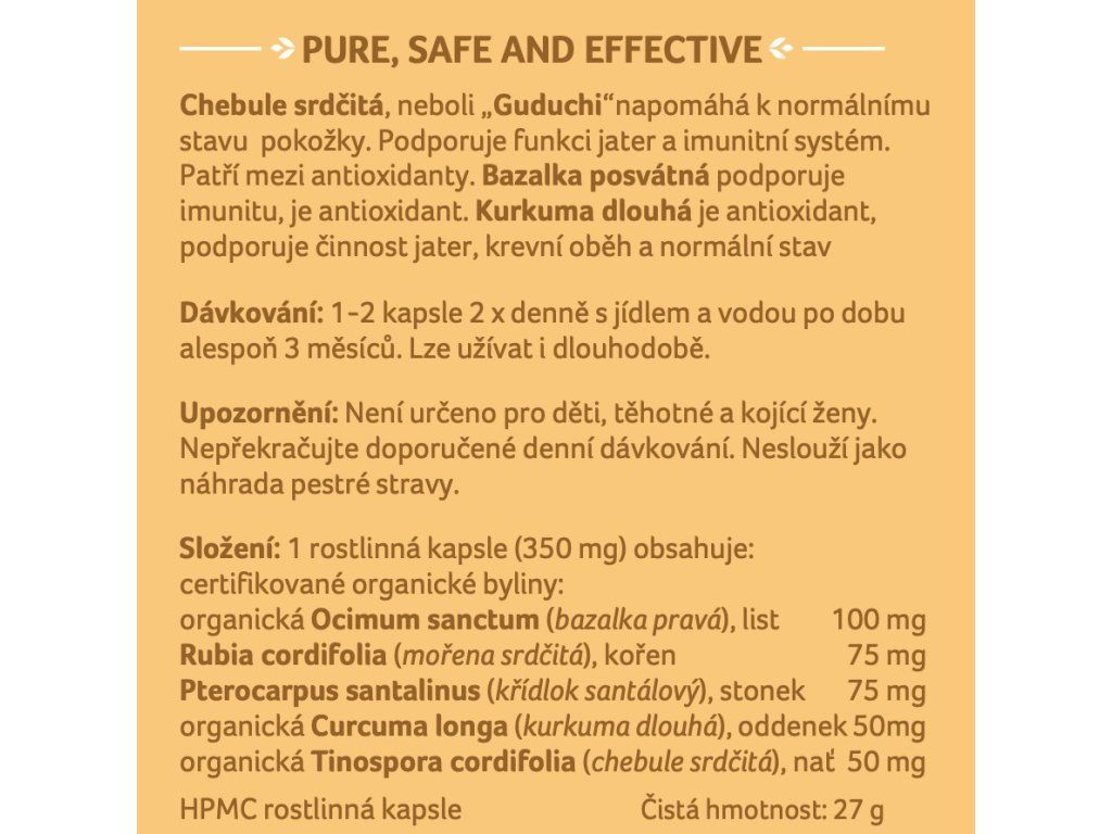 Užívejte jednu až dvě kapsle denně společně s jídlem. Není vhodné pro děti, těhotné a kojící ženy. Vhodné i pro vegany.