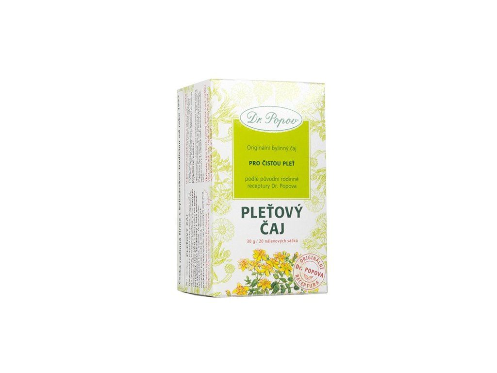 Pleťový čaj Dr. Popova je směs ze 7 výtečných bylin. K těm hlavním užitým patří maceška, řepík a třezalka, které se podílejí na zdravém stavu pleti. Čaj dále obsahuje byliny pro podporu vylučování škodlivin z těla močí – růžový ibišek květ a maliník.