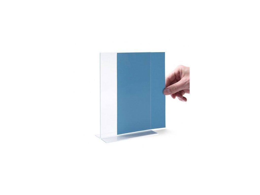 Umístění na pult nebo na stolek. Kvalitní čirý plast stojánku. Formát A5 na výšku.