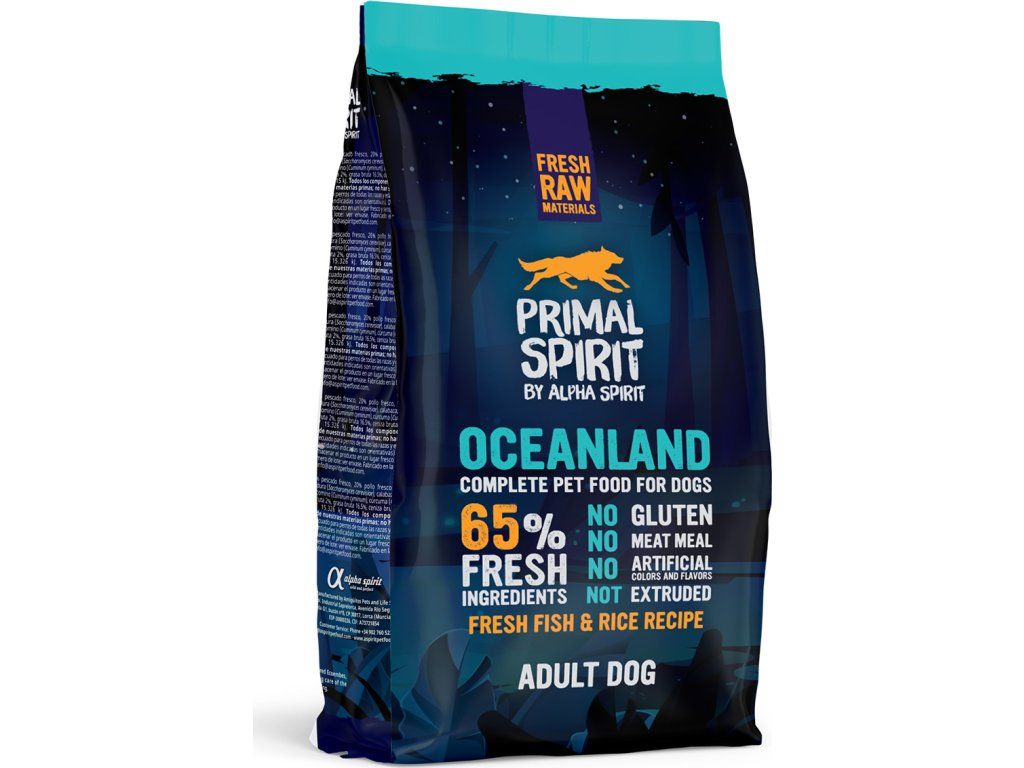 Primal Spirit Dog 65% Oceanland jsou za studena lisované granule pro dospělé psy všech plemen s vysokým obsahem čerstvých ryb z Atlantiku doplněné o hydrolyzovanou rýži, ovoce a zeleninu. Krmivo s nízkým obsahem obilovin. Bez obsahu lepku, bez GMO, bez masokostní moučky, bez umělých konzervantů, dochucovadel a barviv, bez extrudace.