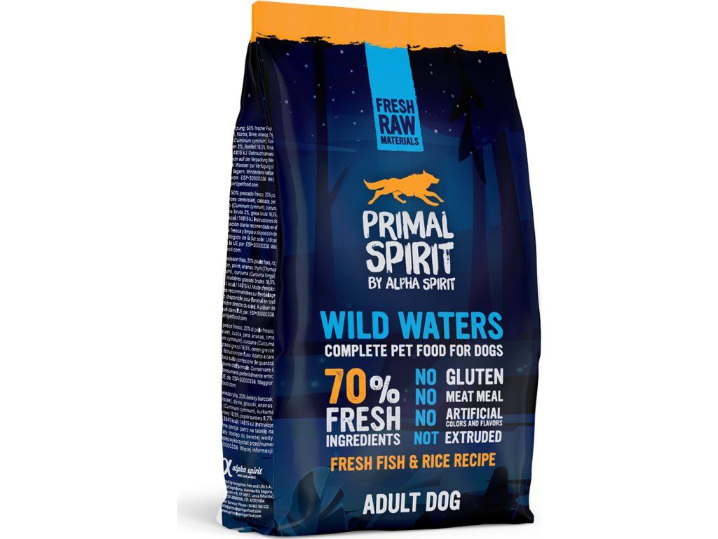 Primal Spirit Dog 70% Wild Waters jsou za studena lisované granule pro štěňata a dospělé psy všech plemen s vysokým obsahem celých čerstvých ryb z Atlantiku a kuřecího masa doplněné o hydrolyzovanou rýži, ovoce a zeleninu.