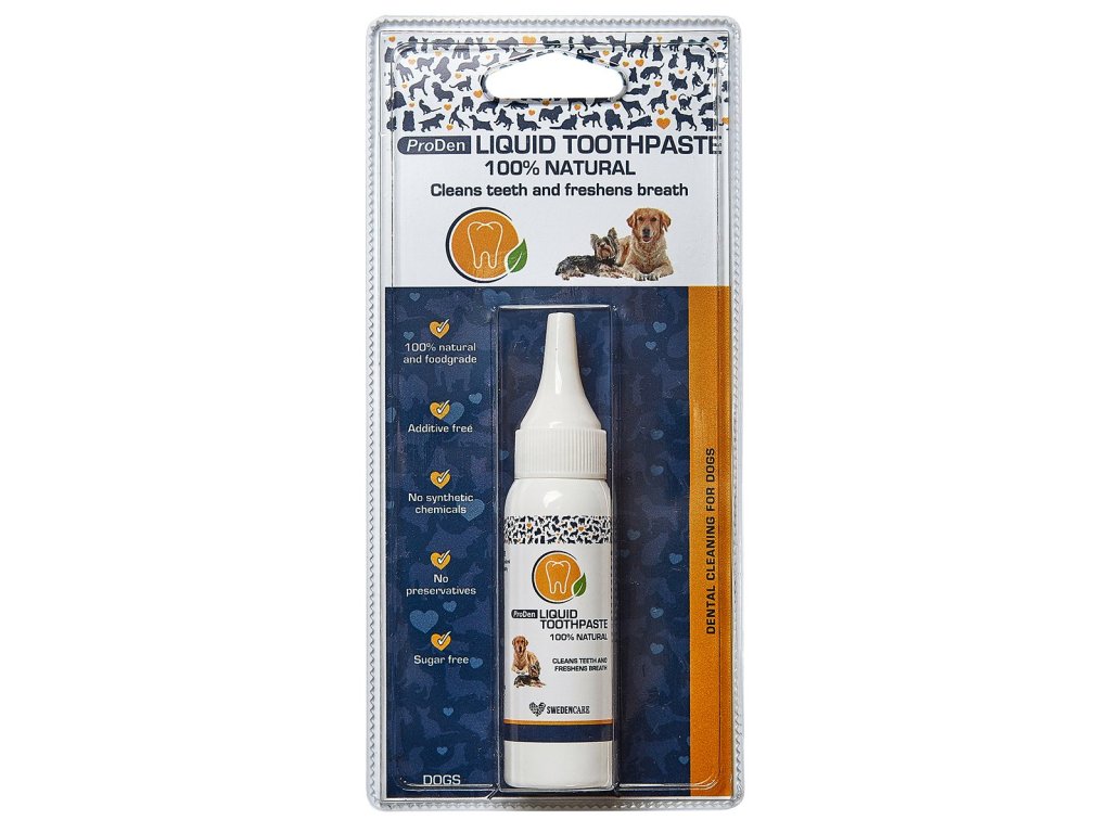 ProDen Tekutá zubní pasta je "dárek" z přírody Je to přírodní zubní pasta a osvěžovač dechu vyrobená ze 100% přírodních a éterických olejů. Je speciálně vytvořena s přísadami, které pomáhají vyčistit zuby vašeho psa, udržovat čerstvý dech, eliminovat špatné bakterie a chránit zuby a dásně.