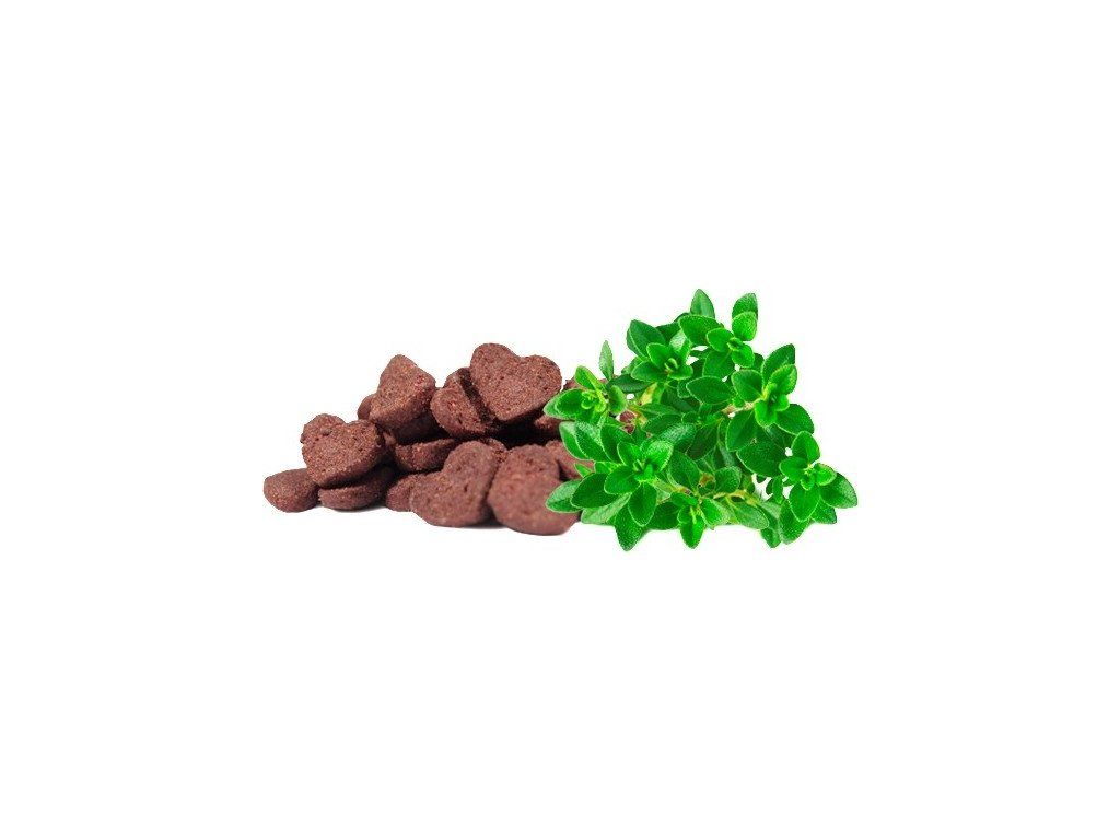 sušený losos, žlutý hrách, zelený hrách, hydrolyzovaný lososový protein, kuřecí tuk (konzervovaný tokoferoly), sušený tymián, sušené jablko, lněné semínko, hydrolyzovaná kuřecí játra.