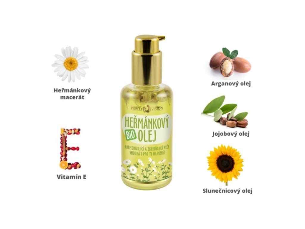 Výroba Bio Heřmánkového oleje začíná sběrem květů heřmánku lékařského. Následuje proces tradiční pozvolné macerace, během které jsou květy naloženy na několik týdnů do směsi za studena lisovaných Bio olejů. V PURITY VISION macerujeme v Bio Slunečnicovém, Bio Jojobovém a Bio Arganovém oleji. Účinné látky tak z Heřmánku přechází do této unikátní pečující směsi, která je následně přefiltrována. Výsledkem je luxusní macerát s omamnou vůní a vlastnostmi ručně sbíraných bylin. Díky tpmuto svému 100 % čistému a přírodnímu původu zajistí heřmánkový macerát pokožce zářivý a svěží vzhled.