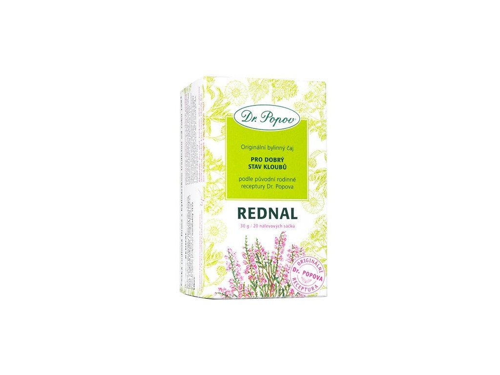 Bylinný čaj Dr. Popova Rednal obsahuje ibišek, černý rybíz a břízu, které udržují normální činnost močových cest a odvod tekutin z organizmu (odstranění přebytku kyseliny močové). Tužebník a černý rybíz podporují zdravý stav kloubů.
