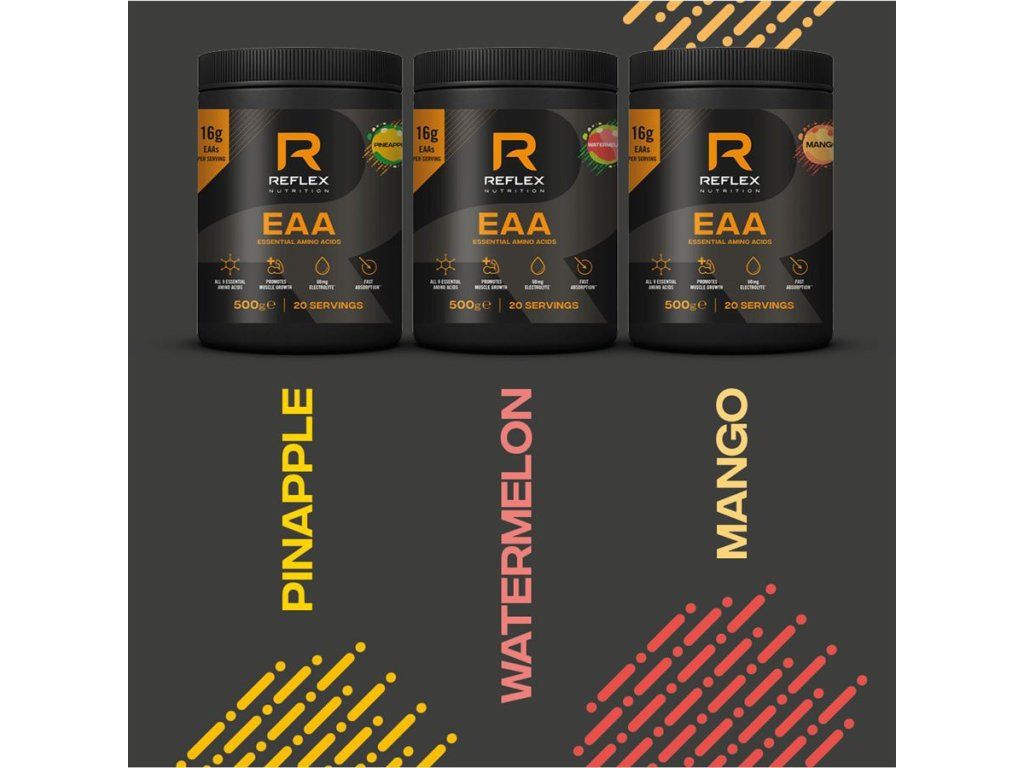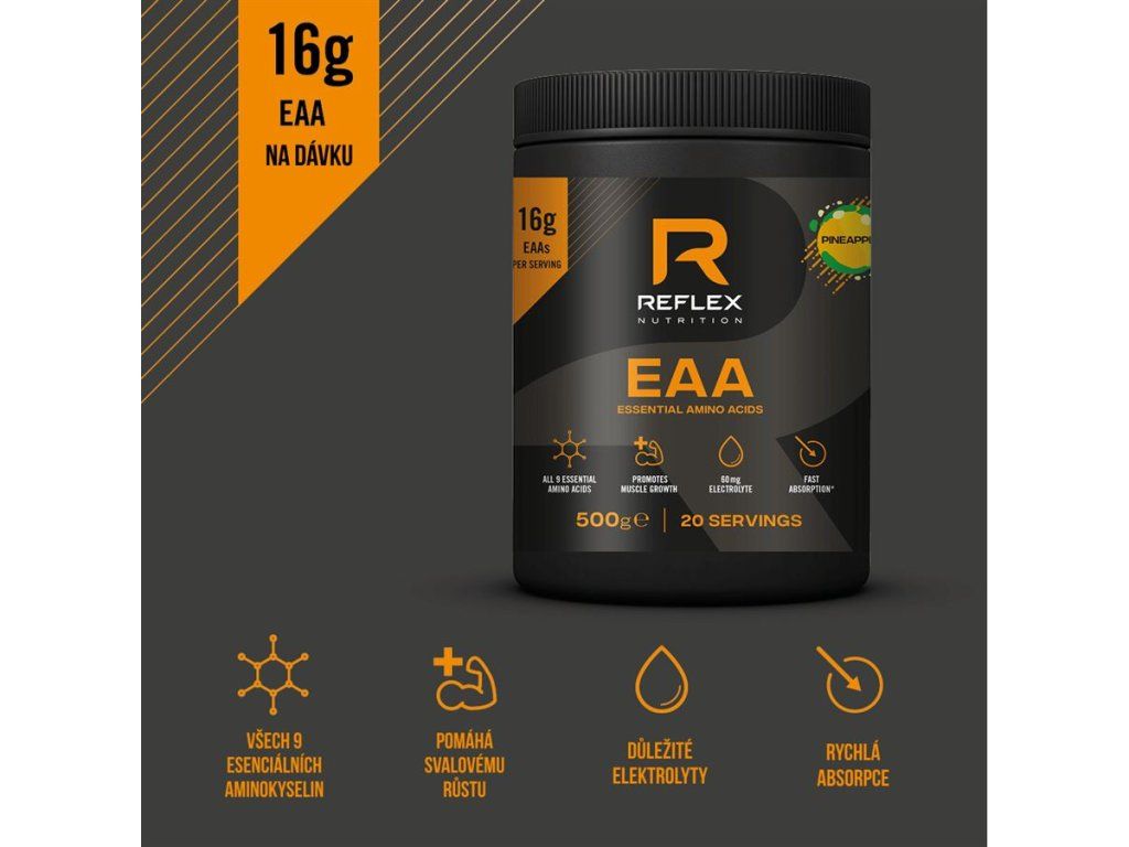 Esenciální aminokyseliny (EAA) jsou aminokyseliny, které si tělo nedokáže vyrobit samo a musí je přijímat ze stravy nebo doplňků. Obsahují i BCAA (leucin, isoleucin a valin) a suplementace EAA je efektivnější než samotná suplementace BCAA, protože poskytuje svalům širší spektrum stavebních látek.
