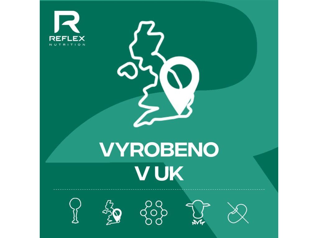 - Vyrobeno v UK: Produkty jsou vyráběny v Brightonu na vlastních výrobních linkách Reflex Nutrition, což zajišťuje maximální kontrolu kvality.