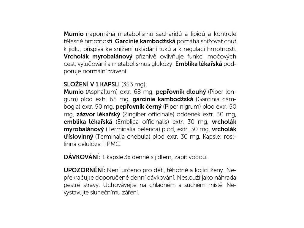 Ecce Vita Reslim obsahuje celkem osm přírodních ingrediencí. Její výjimečnost je v kombinaci tří ovocných plodů známé jako Triphala s mumiem a garcínii kambodžskou. Směs krásně podpoří pepř dlouhý, pepř černý a zázvor lékařský.