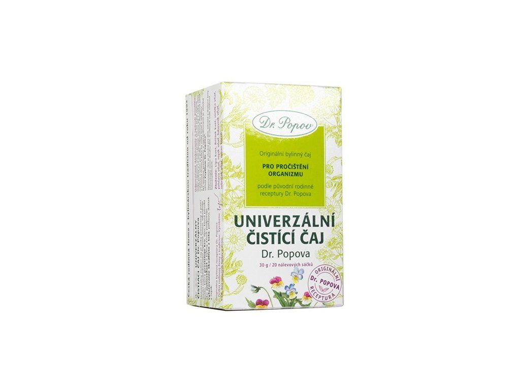 Univerzální čistící čaj Dr. Popova obsahuje byliny vhodné pro čištění organizmu. Kopřiva čistí krev a podporuje správnou činnost ledvin, lípa je známá pro své antioxidační vlastnosti a společně s maceškou se také podílejí na čištění krve. Pro vyšší účinek jsme do čaje použili ještě ibišek, řepík, třezalku, řebříček a oman.