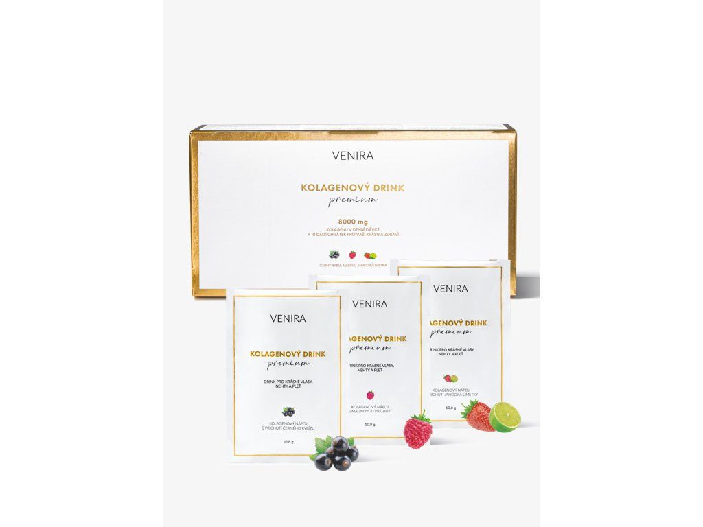 VENIRA PREMIUM kolagenový drink pro vlasy, nehty a pleť, mix příchutí (jahoda-limetka, černý rybíz, malina), 30 sáčků