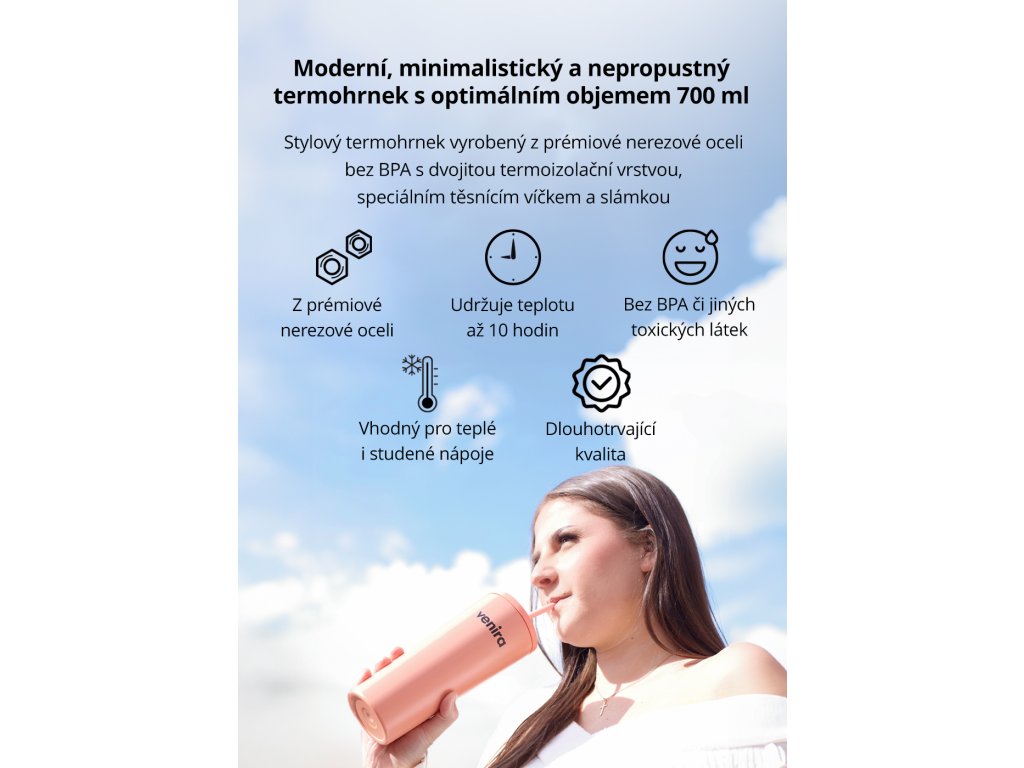 Dvojitá termoizolační vrstva termohrnku udrží nápoje studené po dobu 6 až 8 hodin a horké po dobu 8 až 10 hodin, což znamená, že si můžete vychutnávat horký čaj a kávu nebo perfektně vychlazený nápoj během celého pracovního dne. Jeho optimální velikost s objemem 700 ml zaručuje, že se vejde do většiny držáků na nápoje a tím ho můžete mít neustále po ruce. Termohrnek neobsahuje žádné zdraví nebezpečné a toxické materiály v podobě bisfenolu A (BPA), které by se z něj uvolňovaly do lidského těla, a proto je maximálně bezpečný.