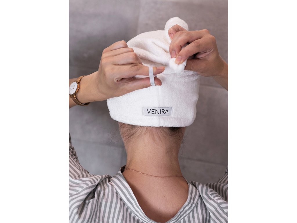 Při nasazování turbanu se předkloňte a umístěte jej na hlavu tak, aby delší konec směřoval ke konečkům vlasů. Jemně zamotejte vlasy do turbanu a zajistěte delší konec směrem dozadu pomocí gumičky. Ponechte turban na hlavě po nezbytně nutnou dobu, aby mohl absorbovat veškerou přebytečnou vodu, a poté jej odstraňte.