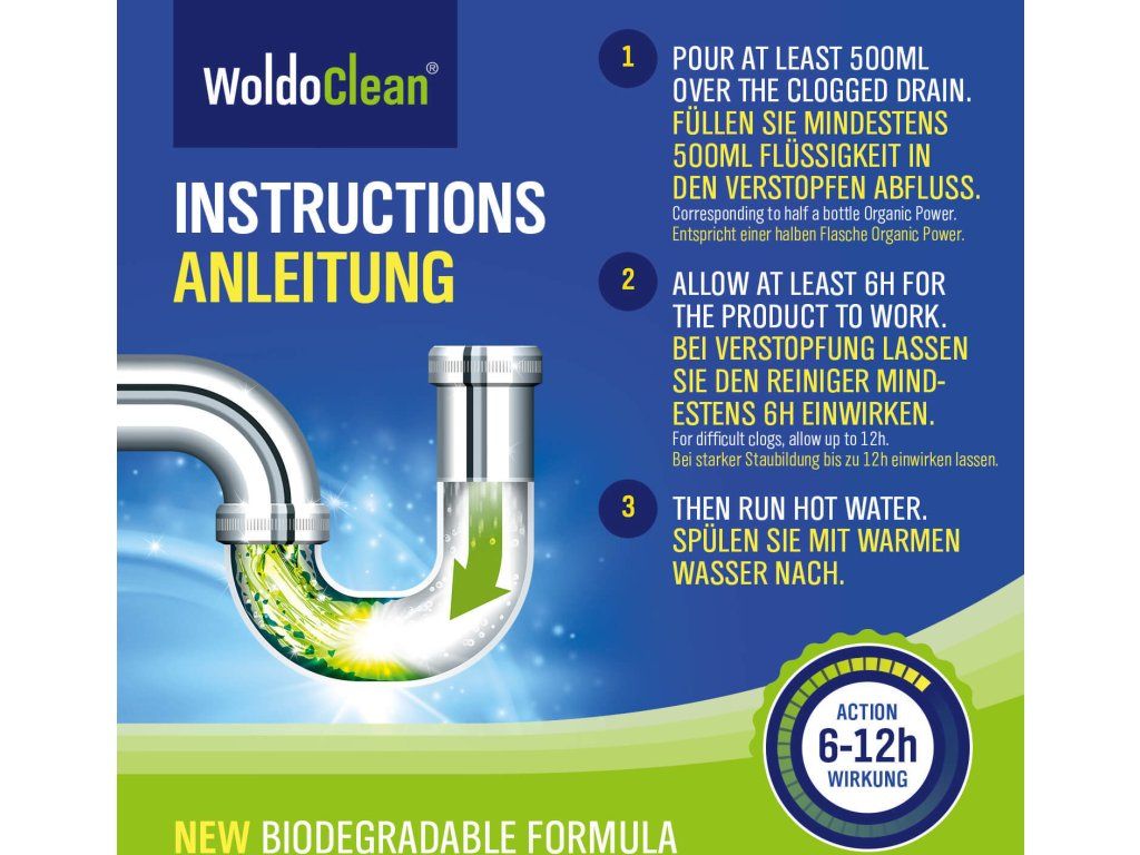 - Pokud je odtok ucpaný, nechte čistič působit nejméně 6h. Pro silně ucpané odpady nechte působit až 12h .
