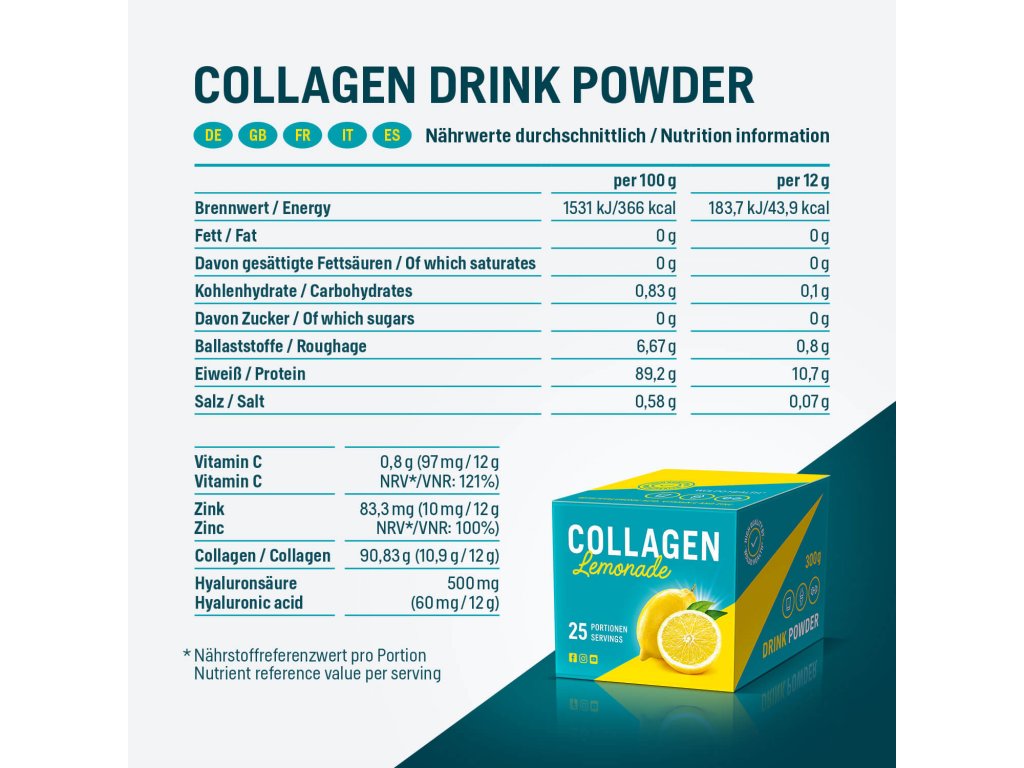 Hydrolyzované hovězí kolagenové peptidy, kyselina citronová, hydrolyzovaný rybí kolagen, citronové aroma, barviva: betanin, kurkumin; kyselina L-askorbová (vitamin C), chlorid sodný, kyselina hyaluronová, sladidla: acesulfam K, sukralosa; oxid zinečnatý.