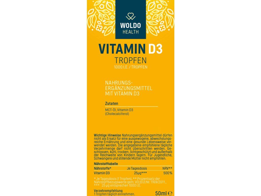 Vitamin D3 je jedna z forem vitaminu D. Pro lidské tělo je nezbytný především proto, že umožňuje lepší vstřebávání a využití vápníku, který má velký význam pro naše zuby a kosti. Stejně tak je tento vitamin rozpustný v tucích důležitý i pro správné fungování imunitního systému. Je tedy pochopitelné, že při jeho nedostatku hrozí vznik zdravotních komplikací. Proto bychom neměli podceňovat přísun vitamínu D3 a nespoléhat pouze na sluneční záření, které je zdrojem vitamínu D. Vitamin D se skládá z několika sloučenin, přičemž ta nejdůležitější a také nejznámější forma se nazývá (cholekalciferol) neboli vitamin D3. Woldohealth Vitamin D3 o síle 1000 I.U. je vitamín D3 rozpuštěný ve 100% MCT oleji, který zajišťuje vysokou biologickou dostupnost Vitaminu D3.